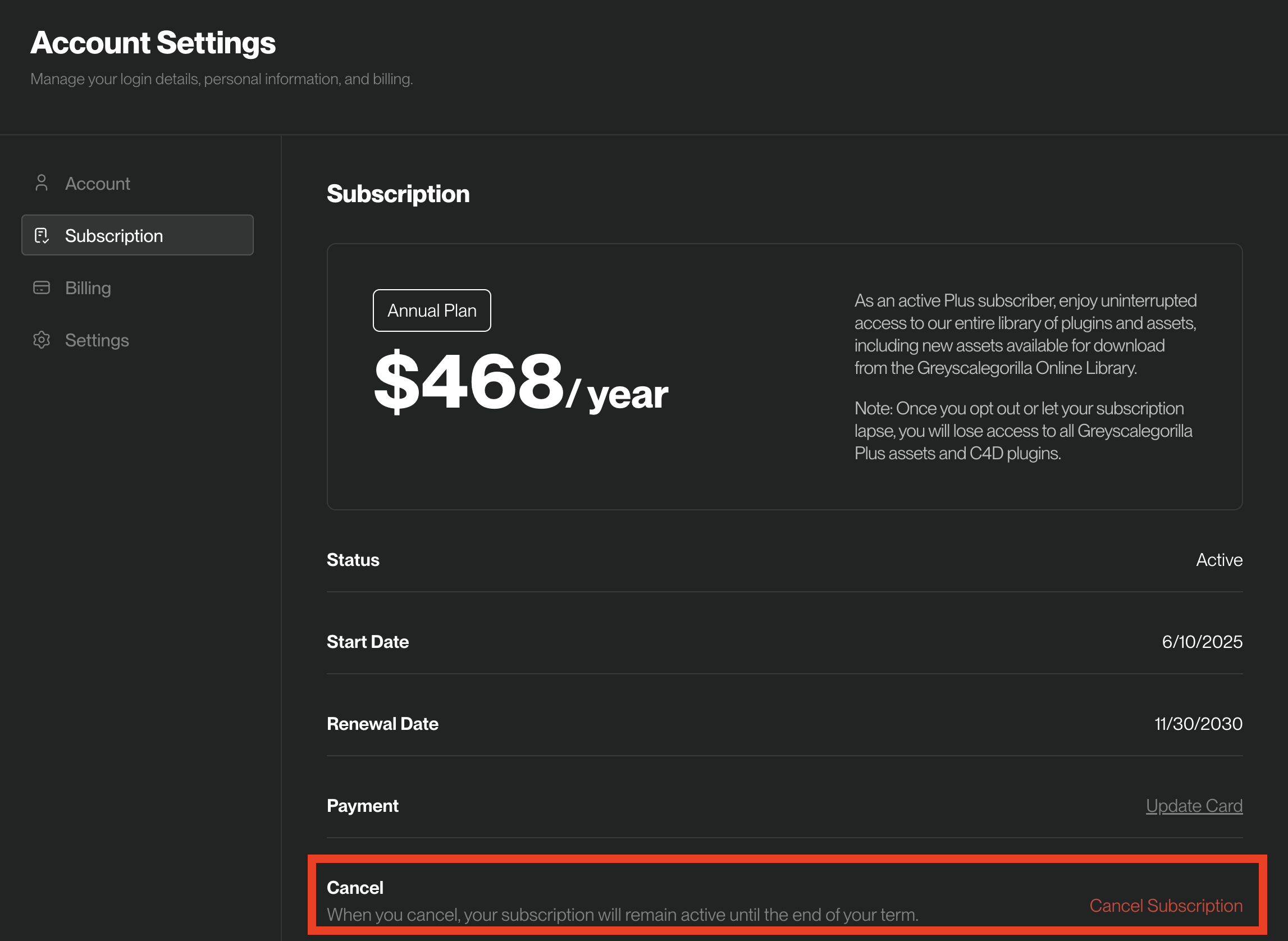 Here in the Subscription section, you can view the status of your Subscription, turn Auto Renew On/Off, change to monthly/annual, and update your payment information.